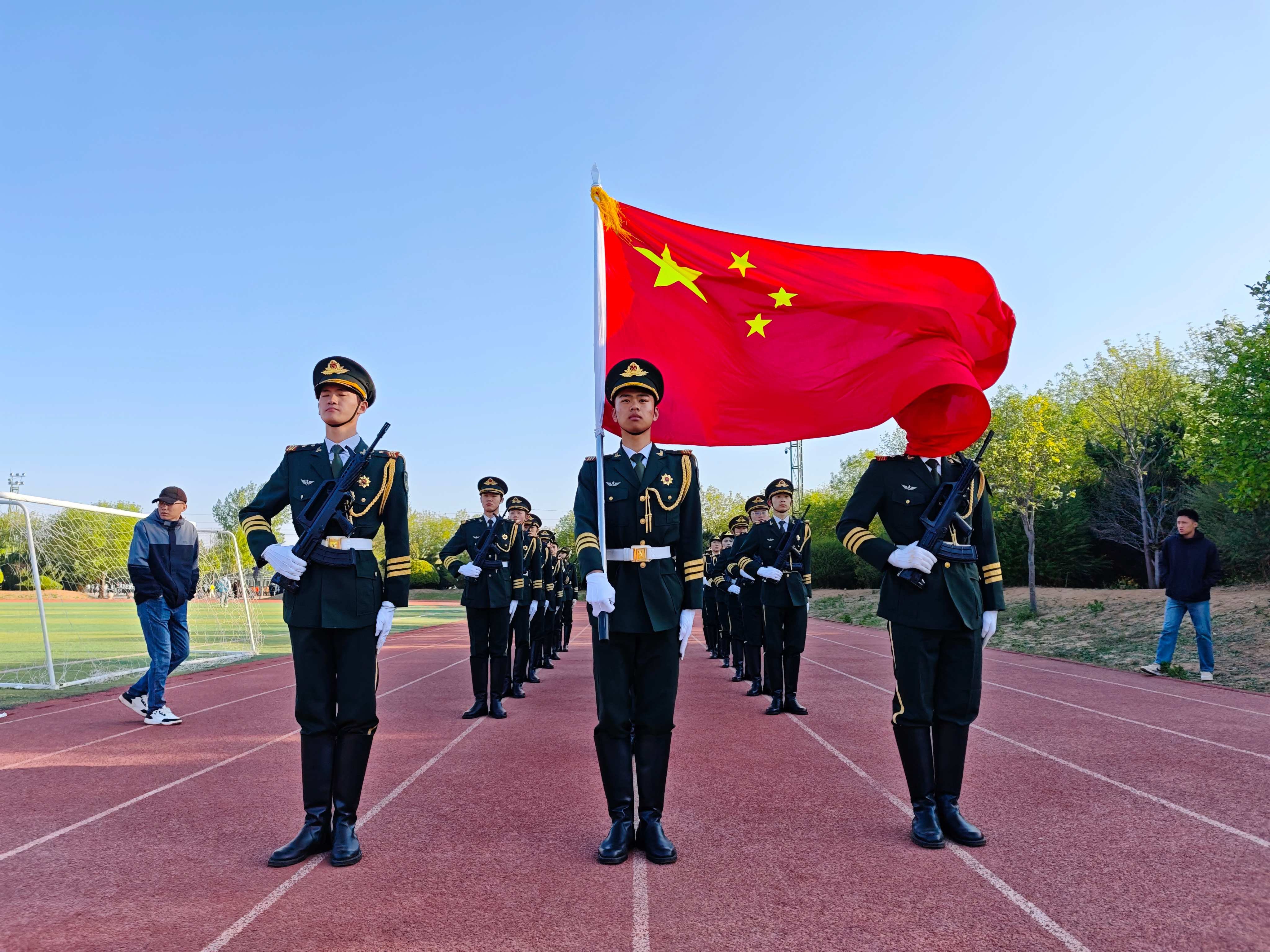 随着激昂的出旗曲奏响,英姿飒爽的护旗手迈着整齐有力的步伐,护卫着鲜艳的五星红旗走向升旗台。全体师生目光坚定,紧紧跟随国旗的移动。随后,在雄壮的国歌声中,五星红旗冉冉升起。师生们庄严肃立,行注目礼,齐声高唱国歌,歌声响彻校园上空。那一刻,仿佛将人们带回到那段浴血奋战的峥嵘岁月,先辈们为了民族独立和人民解放,不畏强敌、坚韧不拔、团结一心、勇于抗争的伟大精神深深感染着在场的每一个人。