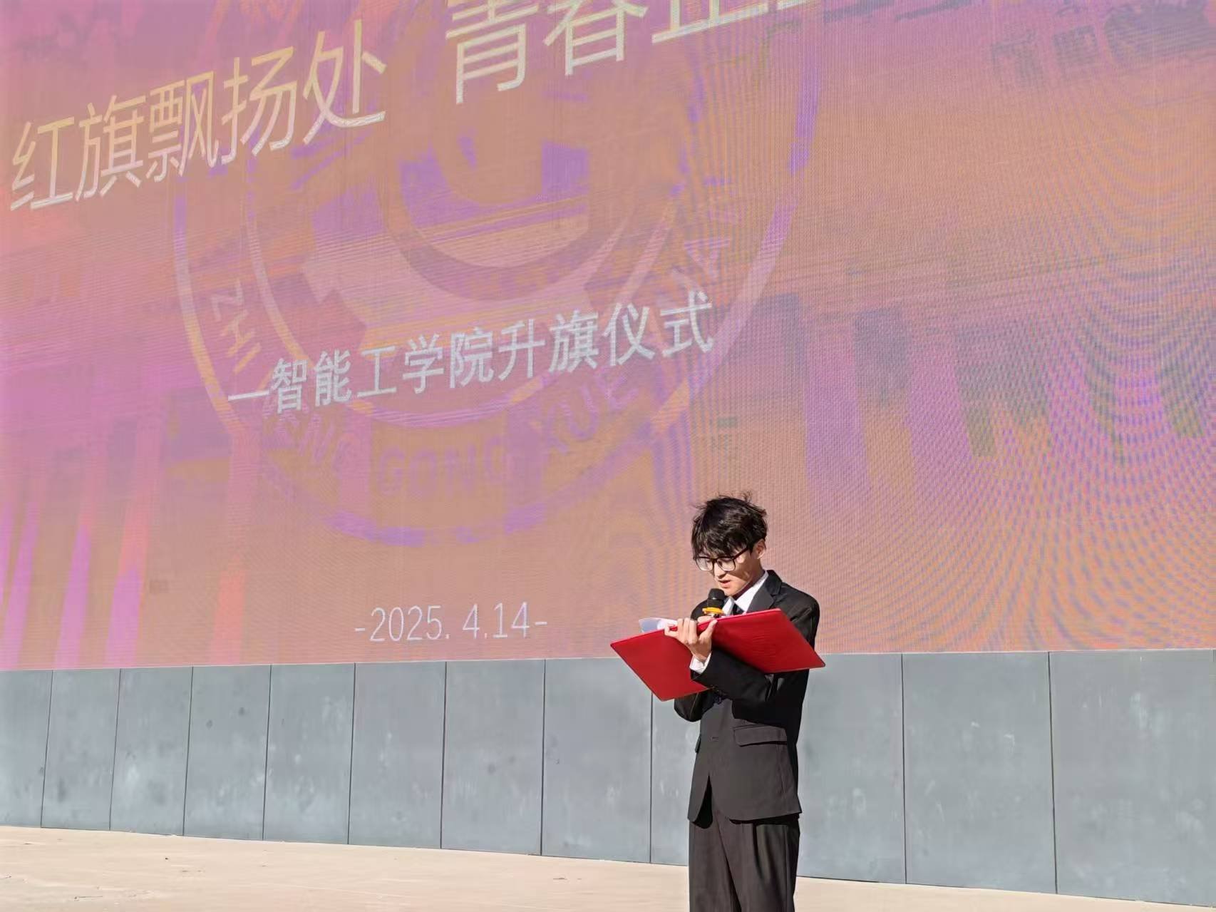 当日早晨 7 时 20 分,活动准时拉开帷幕。智能工学院全体师生整齐列队,精神抖擞地齐聚操场,现场气氛庄重而肃穆。主持人率先登台,向师生们介绍了本次升旗活动的特殊意义,在抗战胜利 80 周年的重要时刻,此次升旗仪式承载着传承历史、启迪未来的使命,旨在让青年学子铭记历史,汲取奋进力量。