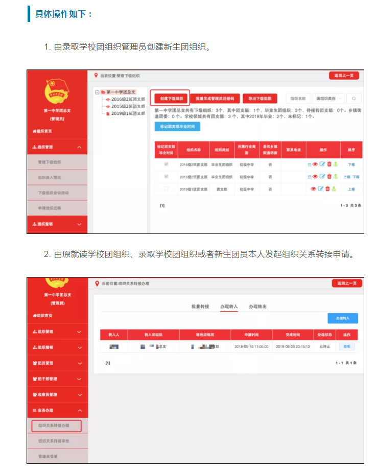 新生团员团组织关系转接工作应于10月31日前基本完成,各级团组织要认真做好团员档案核查和组织关系管理工作,积极为广大新生团员提供贴心帮助。转接组织关系过程中,如遇困难或疑问,可登录“智慧团建”系统网页(>