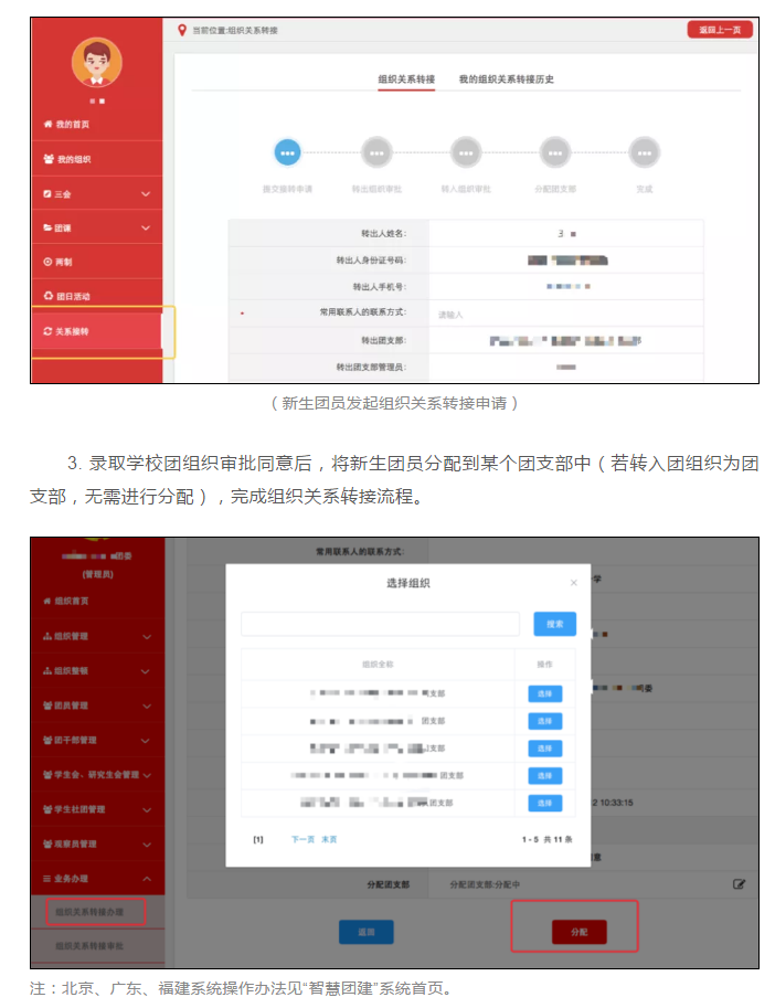 按照《“智慧团建”系统毕业学生团员组织关系转接工作指引(第一版 2020年)》关于新生团员团组织关系转接工作要求,录取学校团组织要在新生入学一个月内,在“智慧团建”系统上创建新生所属团组织,并及时将新生团员团组织关系转入。原就读学校团组织和团员本人也可在录取学校新生团组织创建后,登录“智慧团建”系统申请将团组织关系转出。新生团员组织关系不得转至团员户籍所在地、生源地或本人、父母居住地的乡镇街道团组织。