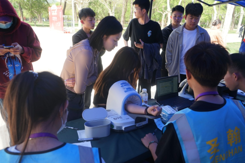 青年志愿者协会志愿者在为献血同学打印体检单,测量血压,指导签字。