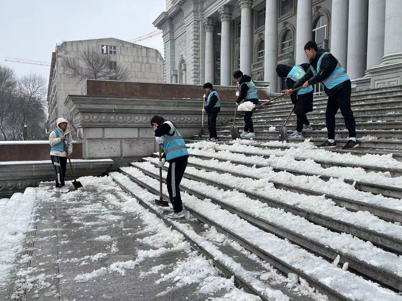 寒风阵阵,并没有阻挡志愿者们除冰扫雪的热情。为了上课方便,出行安全刘军凯老师携自愿者们及时清扫学校吉纯楼台阶、门口的积雪。