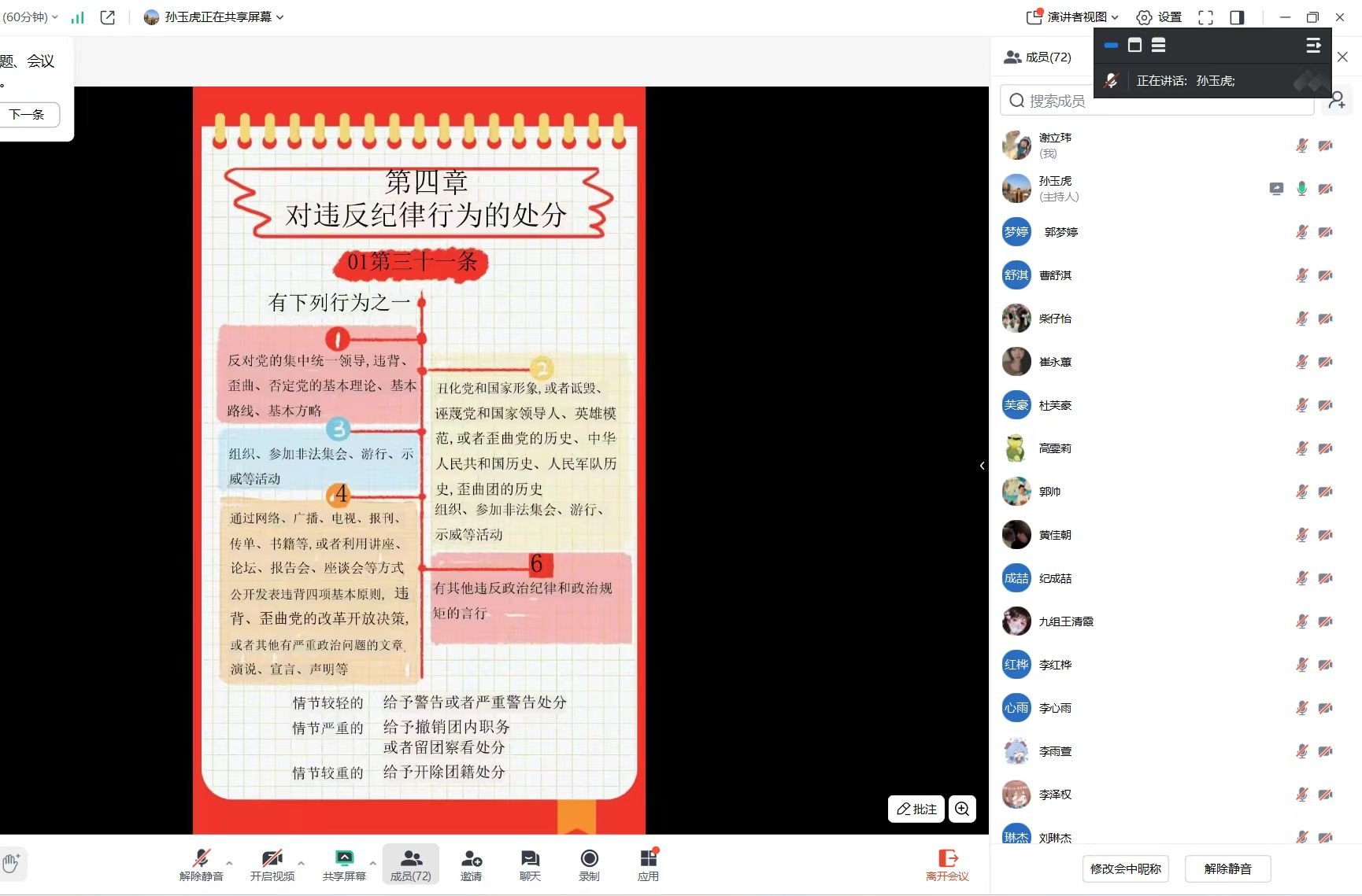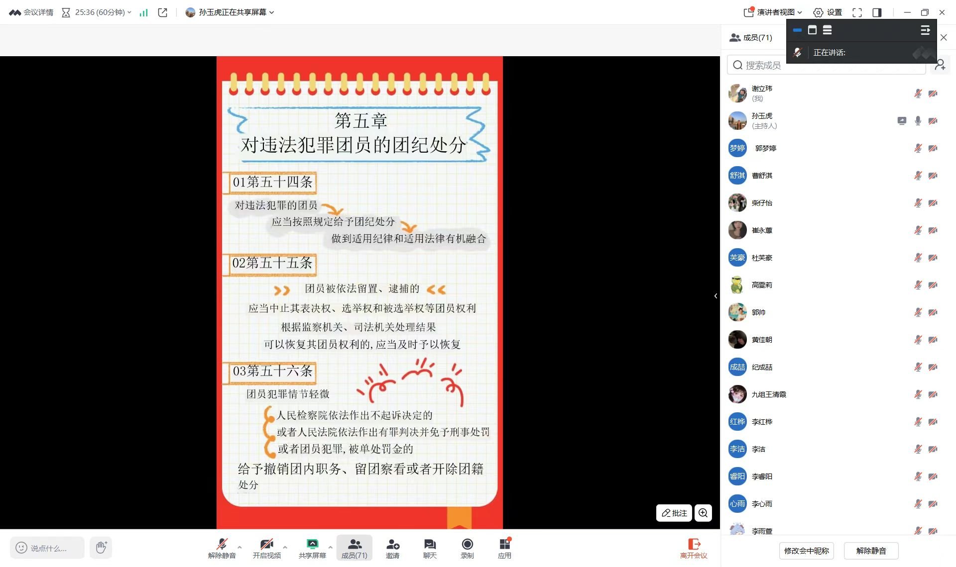 为强化团员纪律性,保障组织健康发展,近日,山东圣翰财贸职业学院校级组织通过线上方式开展《中国共产主义青年团纪律处分条例》科普活动,校学生会主席孙玉虎同学担任主讲,全体团员青年积极参与其中。