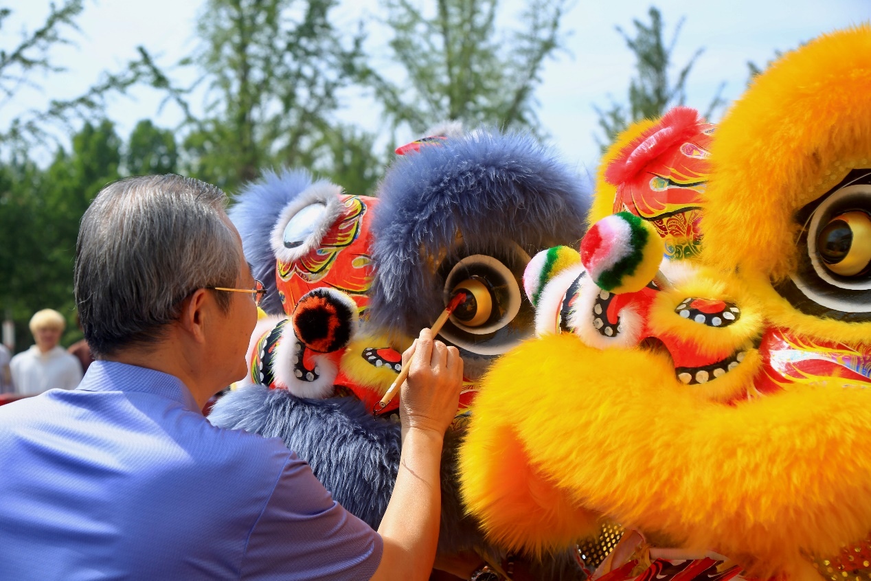 活动现场,锣鼓铿锵,金狮跃动。激昂的鼓点如惊雷划破长空,瞬间点燃全场气氛。身披五彩锦绣、红鬃飞扬的醒狮昂首阔步,踏着鼓点节奏,在八仙凳间灵巧穿梭,仿佛赋予了狮身鲜活的生命。龙狮协会的队员们默契无间,将狮头操控得活灵活现——炯炯有神的狮目随着鼓点节奏眨动,抖毛挠痒时憨态可掬,弓背腾跃间威风凛凛,将南狮“喜、怒、哀、乐、动、静、惊、疑”八大神态演绎得淋漓尽致、惟妙惟肖。