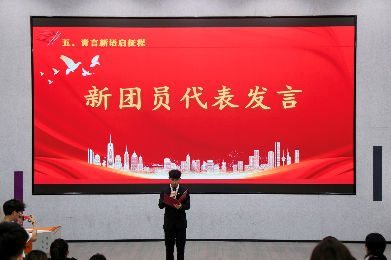 信息工程学院团总支书记孟莉带领新团员面向鲜艳的团旗,右手握拳,庄严宣誓。“我志愿加入中国共产主义青年团,坚决拥护中国共产党的领导……”,铮铮誓言,响彻全场,这是新团员们对团组织的庄严承诺,也是他们青春奋斗的誓言。新团员代表郑永康同学在发言中表达了对加入共青团的喜悦与自豪,分享了自己对团员身份的理解,并表示将以实际行动践行誓言,在学习和生活中发挥模范带头作用,努力成长为有理想、敢担当、能吃苦、肯奋斗的新时代好青年。