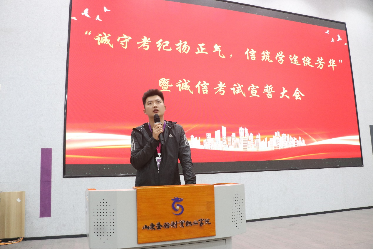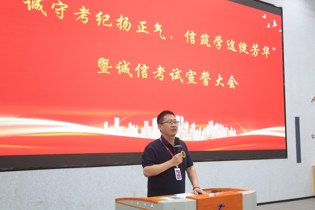 活动现场,气氛庄重热烈,“以诚立身,以信应考”的主题横幅高悬,宣传标语醒目,营造出浓厚的诚信氛围。活动伊始,艺术学院学管院长杨其义以“诚信是立身之本”为切入点,结合古今诚信典故与学术道德案例,深刻阐述了诚信考试对个人成长与校园文化建设的重要意义,引发在场学子共鸣。