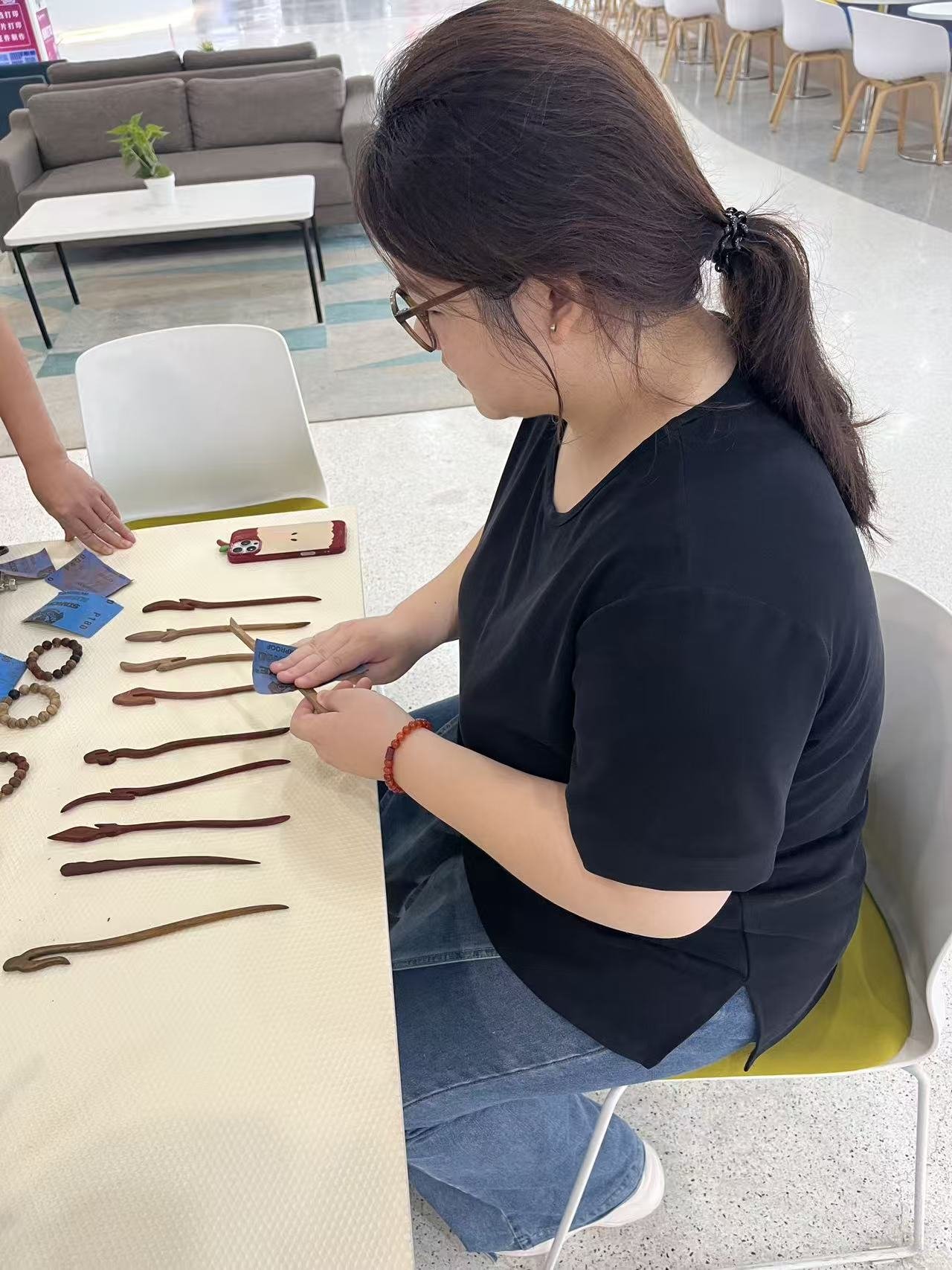 在非遗传承人郑老师的指导下,新生们亲手体验操作佛珠刀,做小叶紫檀手串的传统技艺。郑老师通过讲解发展史、演示制作工艺,引导学生做小叶紫檀手串作品。学生们在小叶紫檀佛珠的过程中,深刻理解了传统工艺中“人化自然”的哲学思想。2025级会计专业新生感慨:“一块木板经过精准切割,竟能完美的呈现造型,这让我明白商业创新需要敬畏传统、精研细节。”