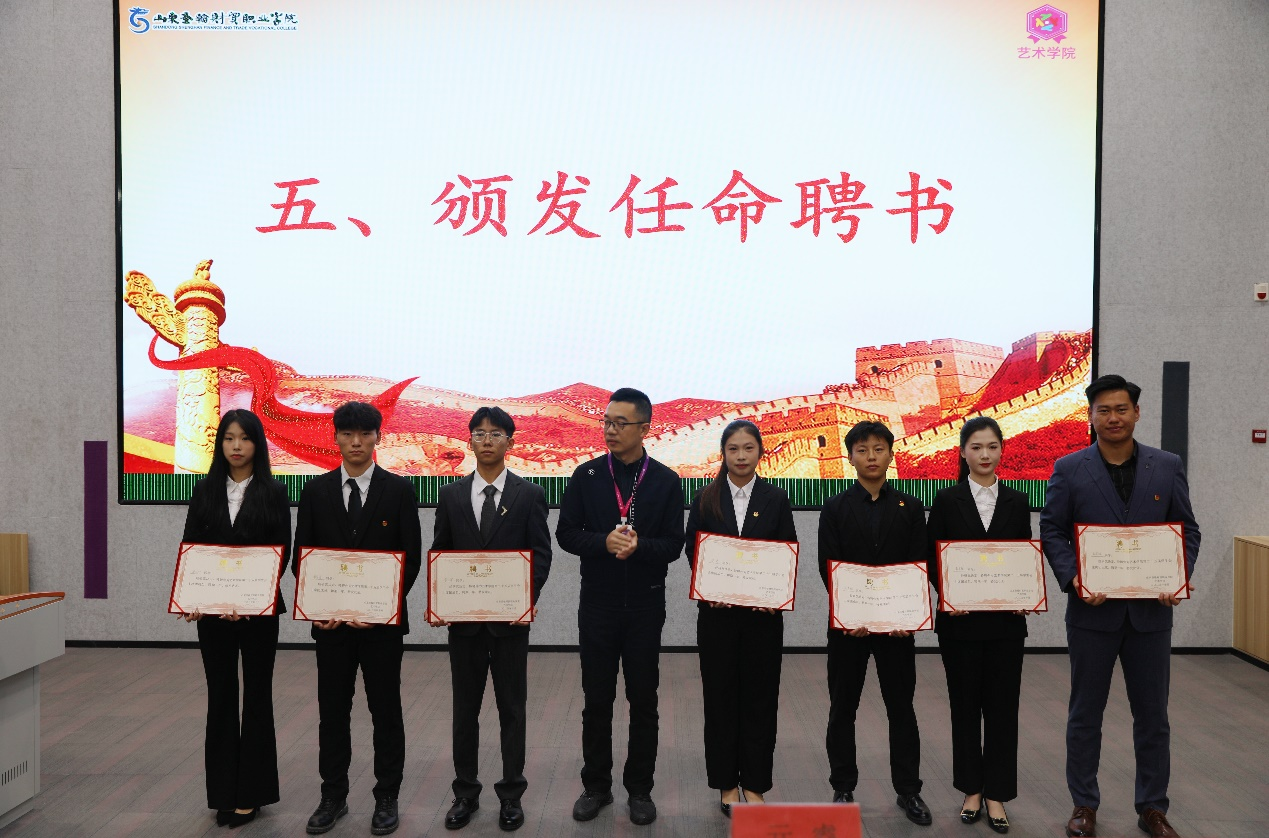 最后,由艺术学院院长亓睿和副院长胡正以及年级组长杨辉、陈婷婷老师共同为新一届学生会干部逐一颁发聘书,双手递接间,传递的不仅是一份印着姓名的证书,更是学校对同学们过往表现的认可,以及对未来履职的深切期许。这份聘书,是荣誉更是责任,是信任亦是嘱托。现场老师们寄语全体干部:“希望大家在新岗位上,以热忱守初心,用务实担使命,把服务同学的小事做细、实事做实,在履职中成长,在担当里发光,为集体发展注入青春动能!”