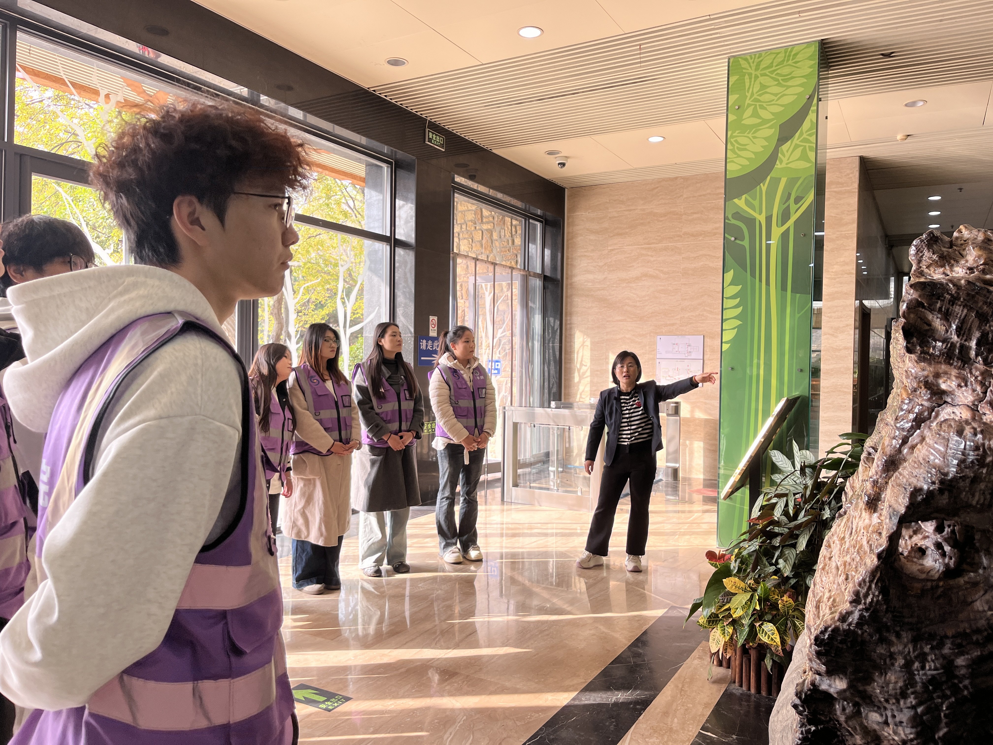 活动尾声,特邀公园园艺老师为志愿者们带来了一场生动的“初冬绿植小课堂”。园艺老师结合公园内的松柏、冬青、悬铃木等常见绿植,详细讲解了冬季植物的生长特性、养护要点以及生态价值,分享了植物如何抵御严寒、保持生机的“小秘密”。同学们围坐一堂,认真聆听、积极互动,在与自然的亲密对话中,进一步加深了对生态文明建设的理解,树立了“爱护绿植、守护环境”的责任意识。