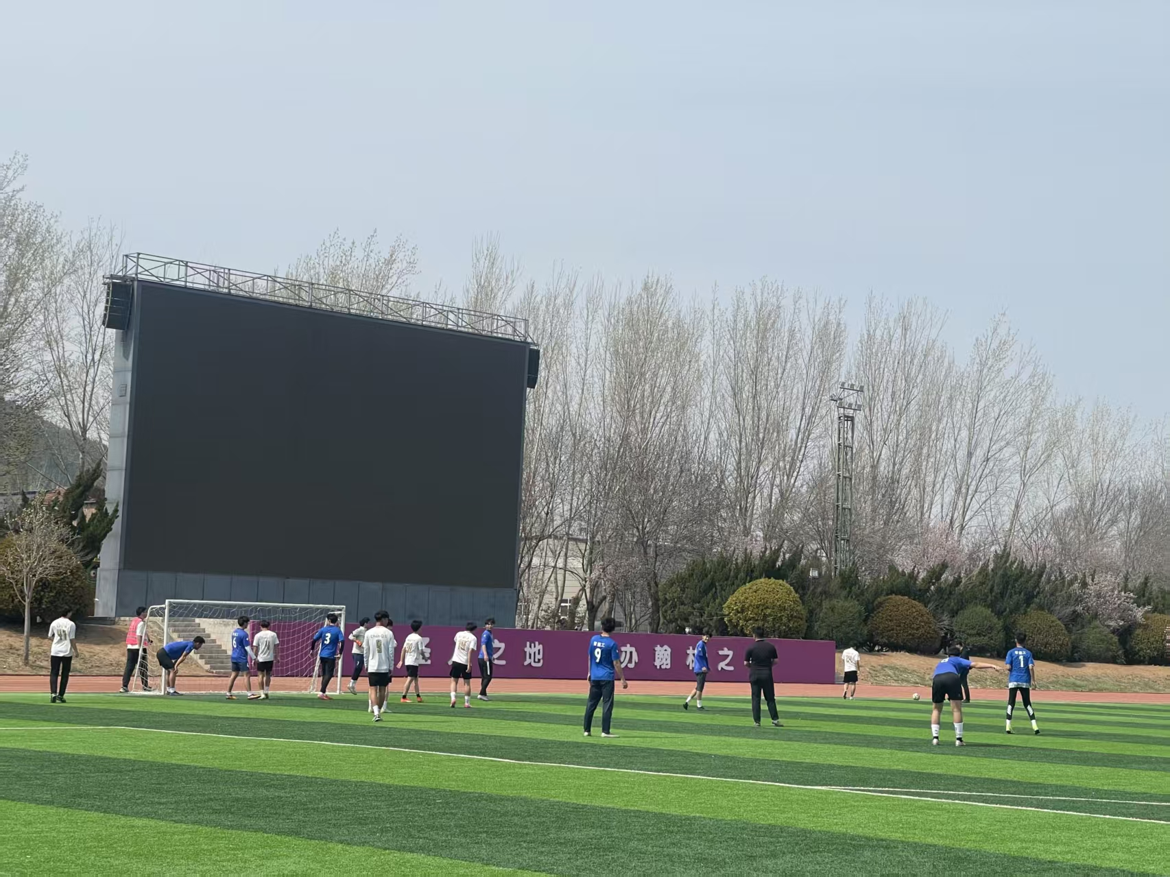赛前,两队球员早早抵达赛场进行热身,舒展筋骨、磨合战术,彼此眼神中满是对比赛的期待与斗志。场边,来自两个学院的同学们组成啦啦队,挥舞着旗帜、呐喊助威,为各自支持的队伍加油鼓劲,热烈的氛围瞬间点燃了整个绿茵场。随着主裁判一声哨响,比赛正式拉开帷幕,双方队员迅速进入状态,展开了激烈的攻防较量。