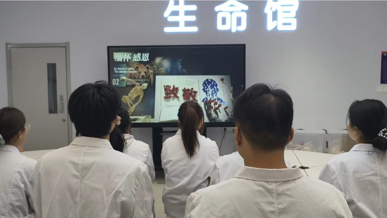 全体人员共同观看《大体老师》纪录片,一个个鲜活的奉献故事让“无言教师”形象更加可感可知,深刻诠释了生命的重量与尊严,唤起了师生对医学人文的共情。观影结束后,学生代表向大体老师纪念墙标本区敬献亲手制作的纸花,全体人员行鞠躬礼,以最庄重的方式表达对无言良师的深切感恩与敬意。