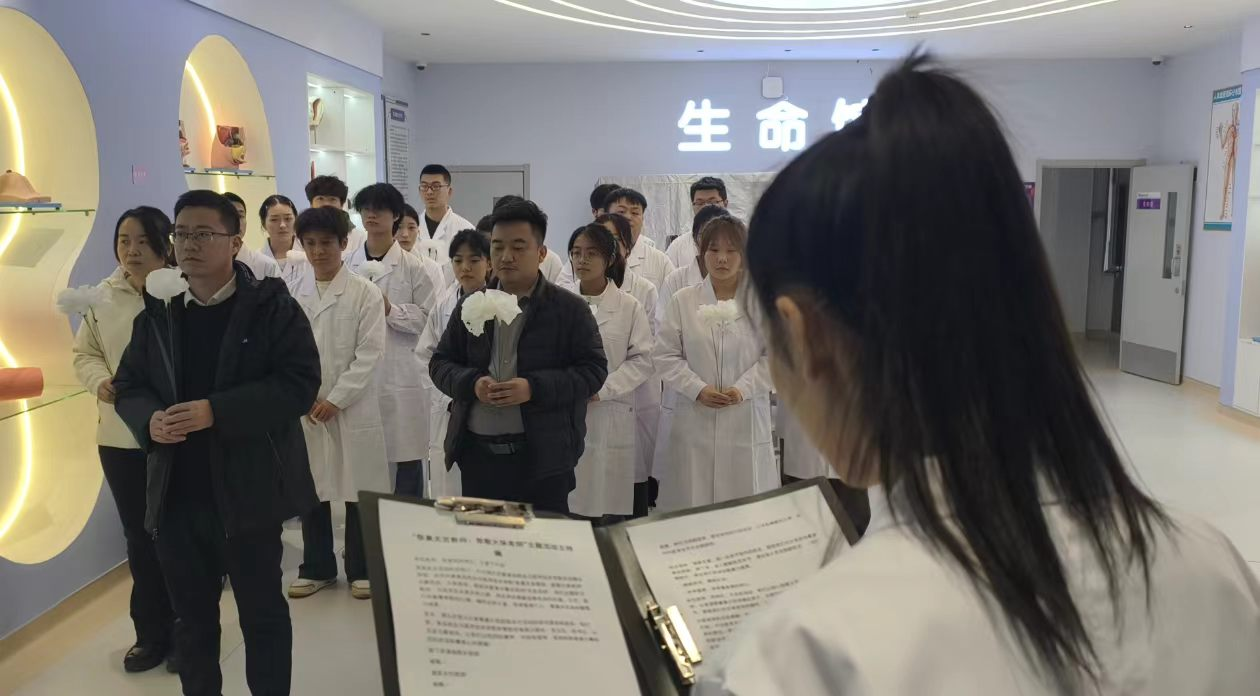 为缅怀大体老师的无私奉献,传承医学人文精神,引导医学生树立尊重生命、敬畏生命的职业理念,3月25日12时10分,食品药品与医学技术学院在健康实训楼生命馆举行“祭奠无言教师,致敬大体老师”主题活动。学院院长杨其义、吴彬主任、团总支书记张红伟、教师代表张玉静及学生代表共同参加。