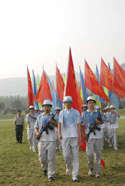 典礼开始,全校师生首先进行了升国旗唱国歌仪式,随后2010级新生把16天来军训的成果进行了汇报表演。分列式,军体操的表演博得了全校师生的阵阵掌声。