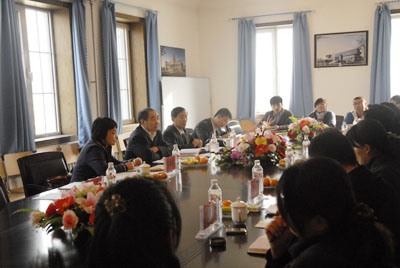 会前由刘大文校长汇报了我校参加此次会议的成员,调研组窦处长向大会介绍了调研组的一行四人。山东省高校工委党建工作调研组组长(原枣庄学院党委书记)张良成首先介绍了本次调研的目的、内容和方式。他说,山东省民办高等教育在我省的高等教育中占有举足轻重的地位,同时也引起了从中央到省委对高校党委建设的高度重视,省委组织部、省高工委也下发了一系列文件,作为加强高校党的建设的重要措施,自2008年9月份就率先开始加大宣传,在全省各高校开展调研活动,并向各民办高校派督导员检查指导工作,这些措施也都取得了积极成果,同时也创造了党建史上的先河。最后他强调了此行的主要目的:一是调研民办党建组织建设情况;二是创先争优开展情况;三是代表省委领导看望派往我校的党建联络员王兴平同志。