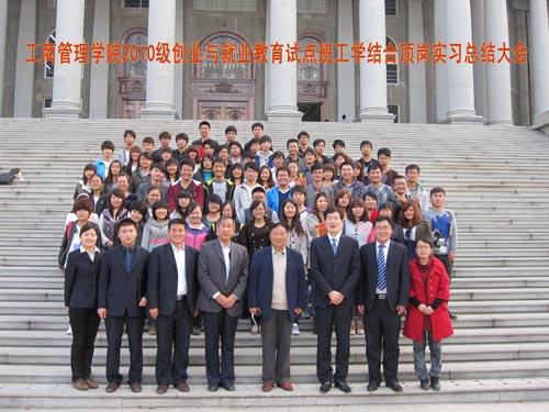 2011年11月1日14:30,工商管理学院2010级创业与就业教育试点班工学结合、顶岗实习总结大会在F3-05隆重举行,刘大文校长、刘岗副校长莅临现场并发表讲话。赵君利副院长宣读了顺利完成实习任务的学生名单及优秀实习生名单;姚涛主任、蒋元涛院长、徐秋娟副院长及冯兴师助理为实习合格的学生颁发了合格证书;刘大文校长和刘岗副校长亲自为优秀实习生颁发了证书和纪念品。