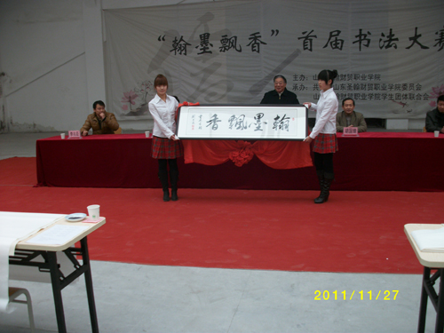 苍劲有力,落笔如刻;遒劲挥毫,浓墨飘香。11月27日,由山东圣翰财贸职业学院主办,山东中医药大学、山东交通学院、山东省劳动职业技术学院、女子学院山东分院、山东协和学院、山东英才学院、山东现代职业技术学院、山东工艺美术学院、山东力明学院、山东职业学院、山东轻工业学院等12所学校共同参加的“翰墨飘香”首届书法大赛在我校圆满结束。我校校长刘大文教授、学生处处长杨磊同志、艺术学院院长胡国锋同志、校团委副书记李兆臣同志、学生处刘金锋老师作为本次大赛的嘉宾评委参加了开幕式。