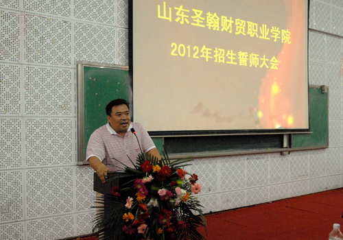 2012年5月8日,我校招生办公室在D5报告厅举行“山东圣翰财贸职业学院2012年招生誓师大会”。校长刘大文教授、常务副校长段勇同志、党委副书记、副校长杨长江研究员、副校长刘广耀同志以及各二级学院院长、行政部门领导出席会议,除此之外,各大区主管以及区域主管和部分优秀招生学生参与本次会议,共计400余人。会议由招生办公室刘增华主任主持。