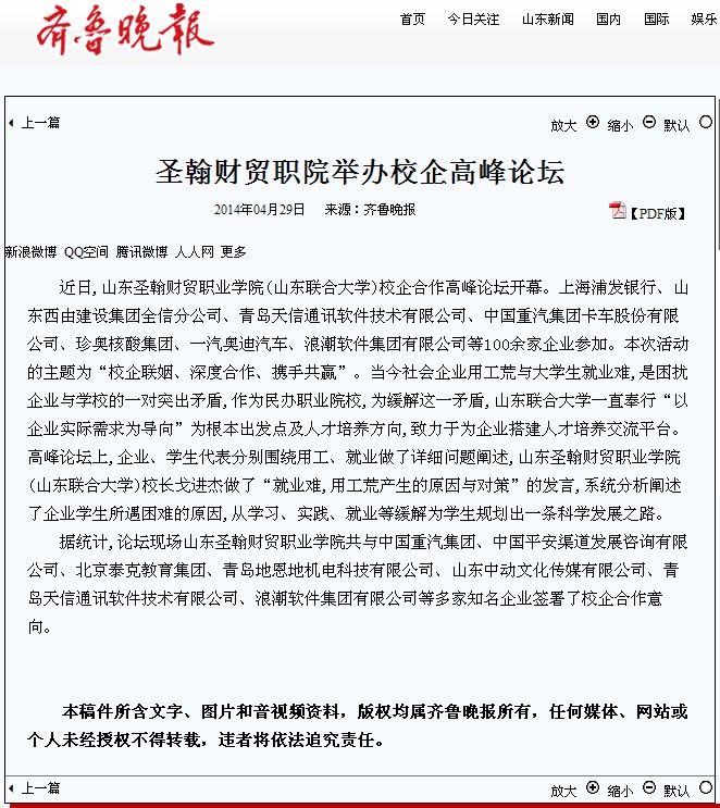 山东圣翰财贸职院举办校企高峰论坛被《齐鲁晚报》报道