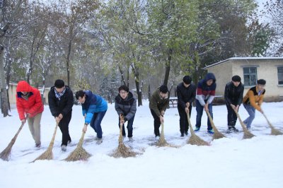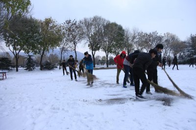 从2015年11月23日夜间开始,连续降雪,路面积雪给校园出行带来极大影响。冒着纷纷扬扬的雪花,严寒的天气下于25日下午18:00开始,全校部分教职工带领全校二级学院的同学们进行校园清雪活动。