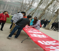 2015年12月10日中午,我校青年志愿者们在圣翰膳堂前摆出签字布并发放红丝带。受到同学们的热烈欢迎,纷纷上前签字明志,领取红丝带。这个活动获得同学们一致好评并表示:此次活动很有教育意义,既给大学生普及了知识,也让大学生们认识到问题的严重性,能够洁身自好,健康成长。