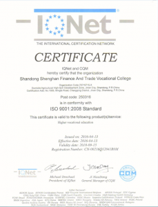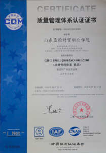 2015年12月10日,我校依据GB/T19001-2008《质量管理体系要求》、《中华人民共和国高等教育法》、《中华人民共和国职业教育法》、《普通高等学校高职高专教育专业设置管理办法(试行)》等法律法规,结合本校服务特点和实际情况,我校编制完成了《山东圣翰财贸职业学院质量手册》、《山东圣翰财贸职业学院程序文件》、《山东圣翰财贸职业学院行业规范》等质量体系规范性文件,并在我校按照质量体系规范实际运行三个月,经ISO9001质量体系认证中心为期两天的全面评估和检查,我校顺利通过评估,于2016年4月13日正式获得ISO9001国际质量体系认证证书。