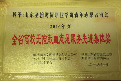 近日,2016年度驻济高校无偿献血工作表彰会在山东大厦顺利举行。会议对在2016年无偿献血工作中,做出突出贡献的88所先进高校和215名先进个人进行了表彰。山东圣翰财贸职业学院荣获多个奖项。