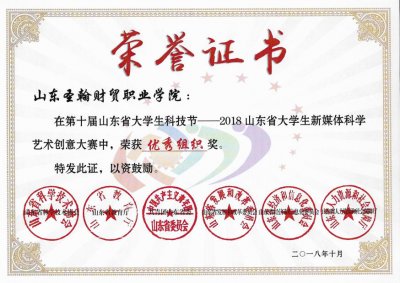 近日,山东圣翰财贸职业学院艺术学院学子在2018年第十届山东省大学生科技节——山东省大学生新媒体科学艺术创意大赛中斩获佳绩。