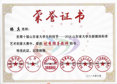 由滕真老师指导的张有博同学的微电影作品《父亲》、宋东泽同学的二维动画作品《遗憾不再》获得二等奖;宋春怡同学的游戏角色设计作品《大梦江湖》、程丹丹、崔佳乐、赵逸飞三名同学生的微电影作品《口罩呆》获得三等奖。滕真老师荣获优秀指导教师称号,山东圣翰财贸职业学院荣获优秀组织奖,成为本次大赛唯一获得此项荣誉的民办高职院校。
