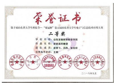 由王桐老师指导的武燕飞、冯伟、张钰欣三名学生的作品“智能温控睡袋”获得二等奖;由宫庆霞老师指导的谢云杭、郭宏健、杨均仁三名学生的作品“音乐演奏辅助装置”获得三等奖;由刘永波老师指导的丁凯、冯宇、郝俊生三名学生的作品“空巢老人智能监护系统”获得三等奖;由张乃文、吴筱老师指导的李颖、秦敬超、苗美茹三名学生和宋梦迪、韩美龙、王杰三名学生分别以作品“速潮搭配”和“家庭宝”获得三等奖。