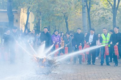 在消防演练环节,刘毅所长向教职工展示了消防灭火器的工作原理、应用场景和使用方法,现场教授教职工掌握正确火场逃生方法。随后,教职工拿起灭火器冲到大火前,紧张有序地拔开插销对准火焰根部喷射,熊熊大火马上被扑灭。为了使每位教职工的都能熟练掌握消防技能,参加演练的200余位员工均在现场专业人员的指导下使用灭火器练习了灭火技能,做到了快速、准确、干脆的灭火。