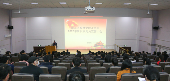 党旗飘扬,凝聚力量。10月26日,山东圣翰财贸职业学院在第一报告厅举行2020年新发展党员入党宣誓仪式。举行宣誓仪式是为了进一步加强学校党组织建设,教育引导新发展党员继承和发扬党的光荣传统,坚定理想信念,增强党性观念。学校党委书记张东超,2020年新发展党员、全体正式党员出席宣誓仪式。宣誓仪式由袁延青同志主持。