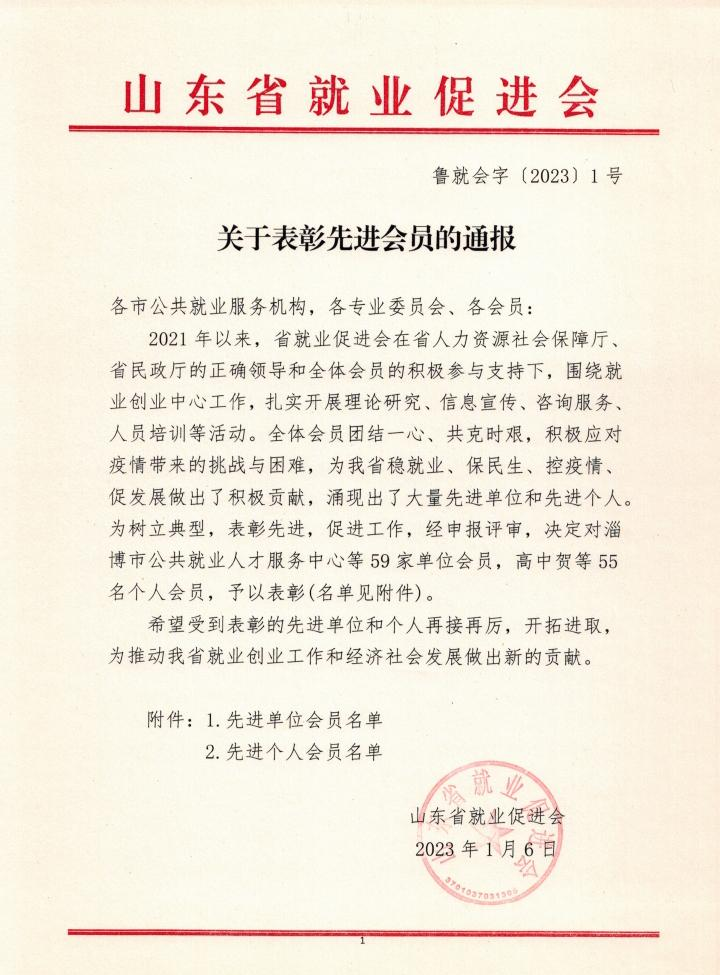 近日,我校被山东省就业促进会评为2022年度先进单位会员,创新创业学院副院长盛雅欣被评为先进个人会员。
