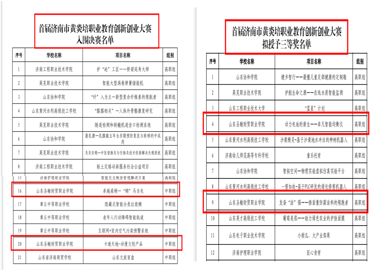 山东圣翰财贸职业学院高度重视“黄炎培”职业教育创新创业大赛组织工作,要求各项目团队高度重视,做到项目内涵和展示的内外兼修。通过积极宣传发动、遴选优势项目、组建过硬团队、强化辅导培育、完善条件支持、落实过程督导,各参赛项目团队心无旁骛的全身心投入备赛工作。此次大赛我校共推进5个项目至济南市黄炎培复赛阶段,其中五年制高职学院中职组:“国粹动漫 文创中国”卡通天地动漫文创产品;公共基础部、智能工学院中职组:卓越桌椅—“椅”马当先,入围济南市黄炎培创新创业大赛决赛,高职组:智能工学院:动力电池的新生——卓凡智能均衡仪、国际交流学院:发奋“涂”强——锈面重防腐涂料的领跑者授予济南市黄炎培职业教育创新创业大赛三等奖。