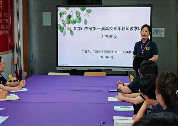 会议伊始,王君萍结合参加山东省高校创新创业类精品微课比赛并获得二等奖的过程,围绕比赛方案中的关键变化、比赛参赛材料的准备方法、教学设计与实施、教学反思等方面分享了自己宝贵的参赛经验;闫英梅结合参加山东省第十届高校青年教师教学比赛的经验心得进行了汇报交流。参会教师也针对教学比赛的疑惑和难点作了交流发言。大家表示,参赛的过程就是一个逼迫自己尽快成长为一个合格教师的过程,比赛让青年教师丰富了教学经验、增加了教学技巧、提升了教学能力、锻炼了上“大讲台”的勇气和毅力。今后,将结合所学所长,进一步提升“用学术讲故事”的能力。