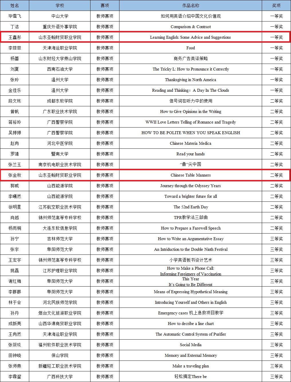 近日,由中国管理科学研究院教育创新研究所教师发展研究中心、中国英语教育研究网主办的2023年第四届全国高等院校英语能力大赛圆满结束,山东圣翰财贸职业学院公共基础部王鑫彤,张金秋两位老师分别斩获一等奖和二等奖,实现了我校在该赛事中数量和等级上的双突破。