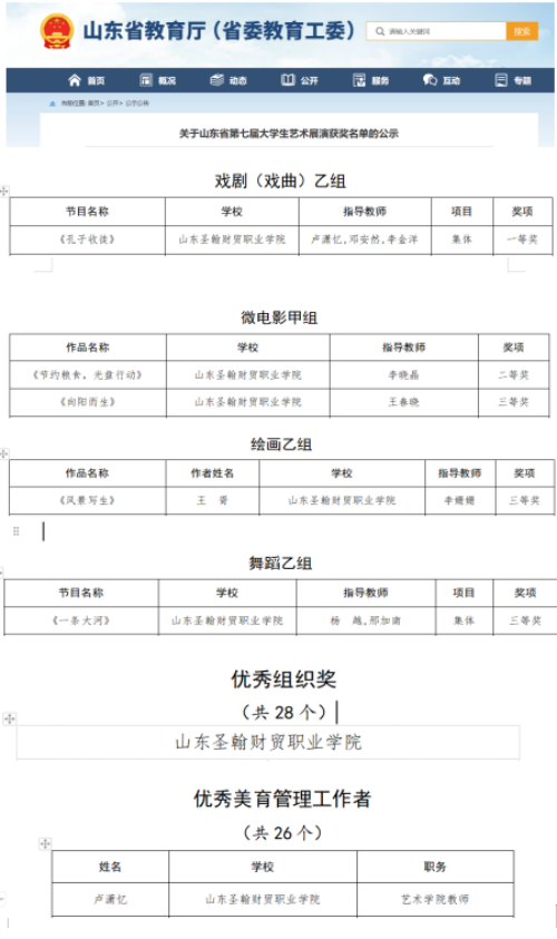 12月25日,第七届大艺展公布奖项,艺术学院在此次规模大、规格高、竞争激烈的省级赛事中硕果累累,尽显风采,共获得全省优秀组织奖、优秀美育管理工作者、一等奖一项、二等奖一项、三等奖三项。本次获奖成果涵盖戏剧、舞蹈、绘画与微电影多个领域,这些奖项的获得,既是对我校学生能力的肯定,也是对我校教师教育成果的肯定。