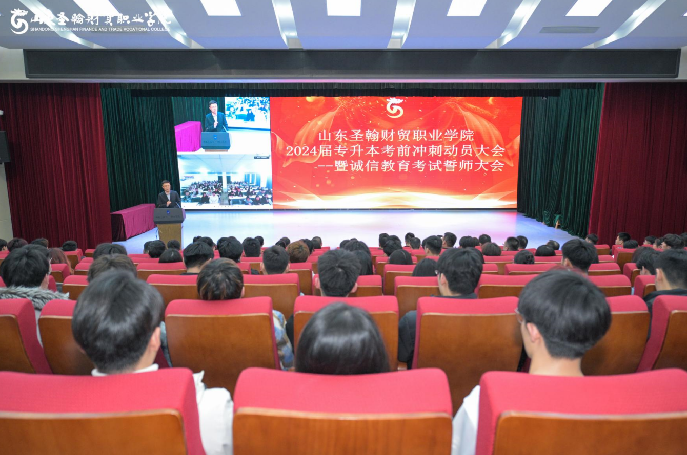 为树立诚信备考、积极向上的优良作风,营造公平公正、严肃有序的考试氛围。3月25日,山东圣翰财贸职业学院在吉纯楼第二报告厅隆重举办2024届专升本考前冲刺动员大会暨诚信教育考试誓师大会。此次大会采用主会场+分会场的形式举行,在主会场参加会议的领导有学校姚东方书记、姜峤副校长、各二级学院院长、行政部门负责人、2024届全体辅导员、2024届部分专升本学生代表;在分会场参加大会的有专升本全体教务、教学老师、在新校区集训的2024届专升本学生,大会由继续教育学院副院长杨玉斌主持。