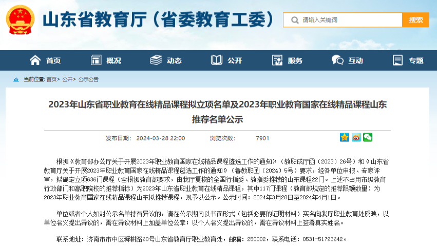 3月28日,山东省教育厅发布《2023年山东省职业教育在线精品课程拟立项名单及2023年职业教育国家在线精品课程山东推荐名单公示》,学校4门课程获批立项,是学校施行“三教改革”取得的标志性成果,实现了学校在课程教学资源建设上的新突破,在省级教学质量工程上的新跨越。