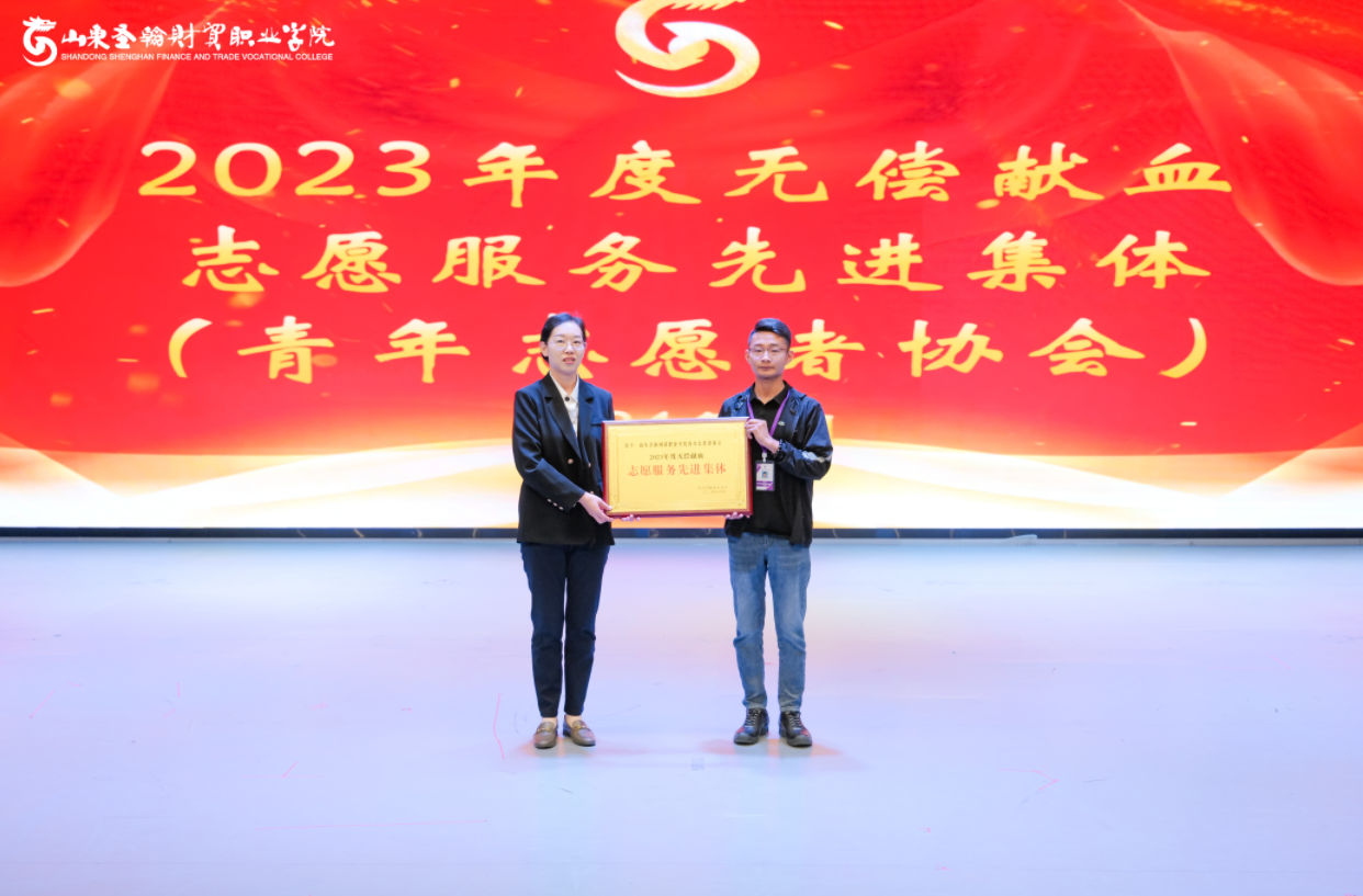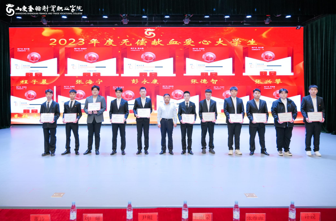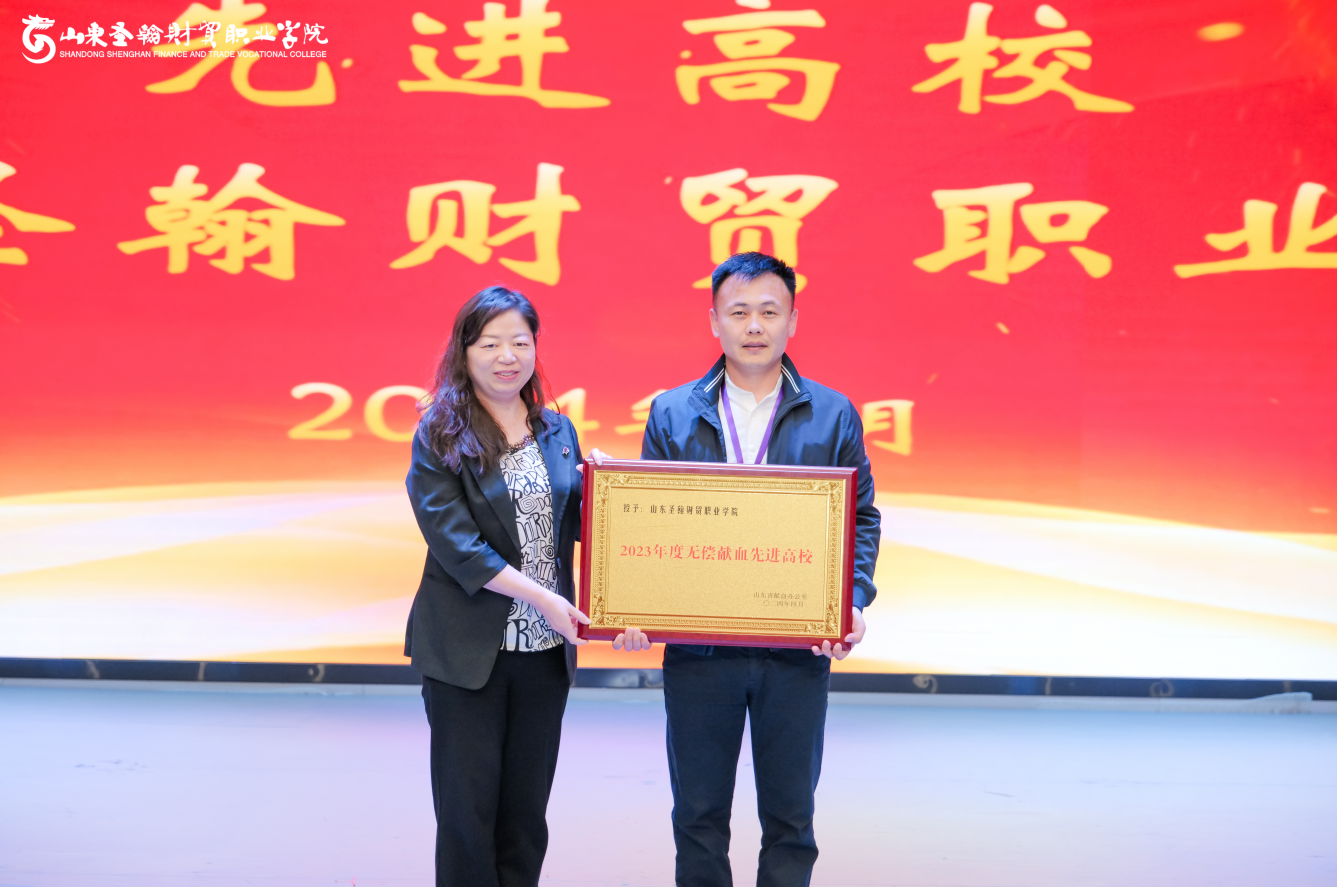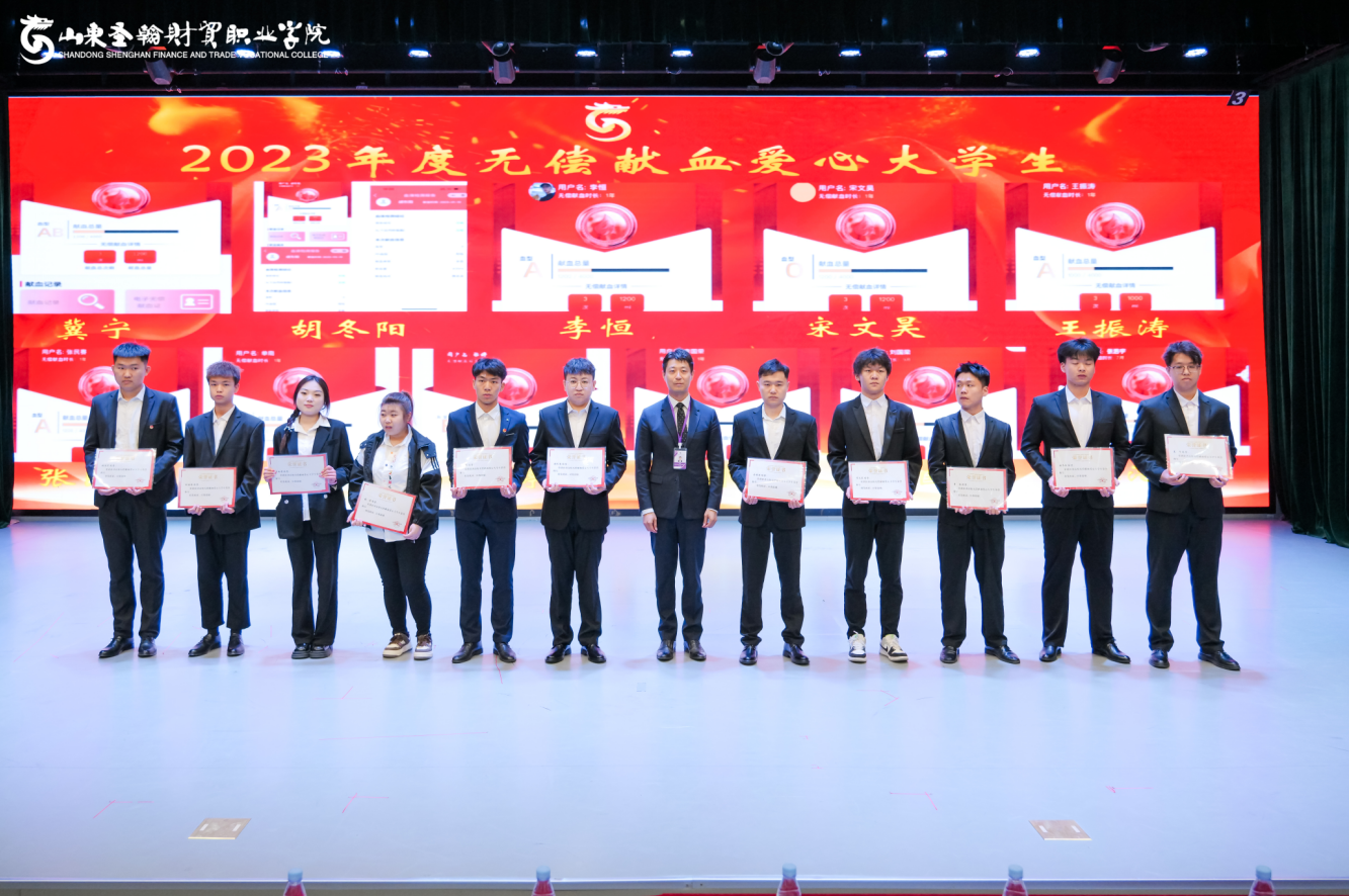 山东圣翰财贸职业学院校长刘广耀为“2023年度无偿献血爱心大学生”颁奖