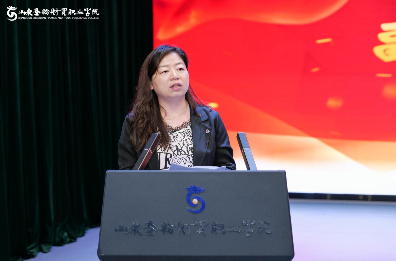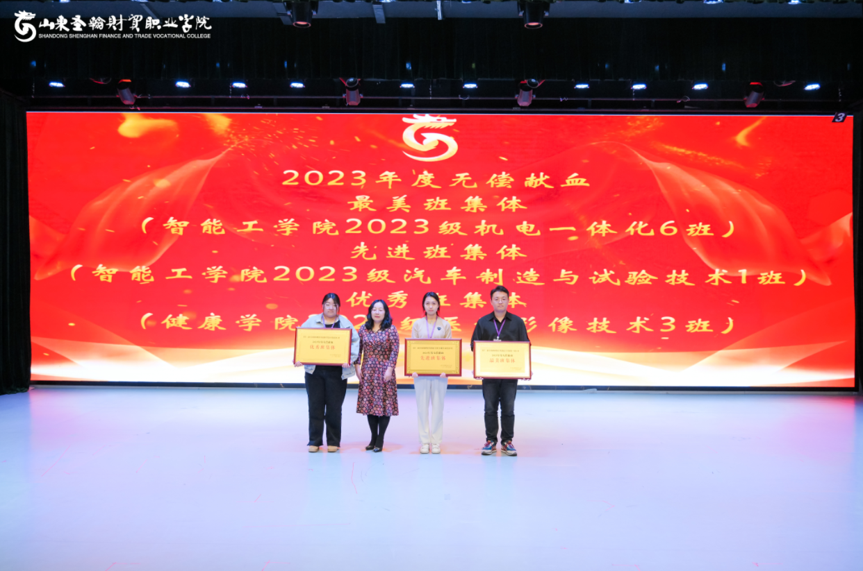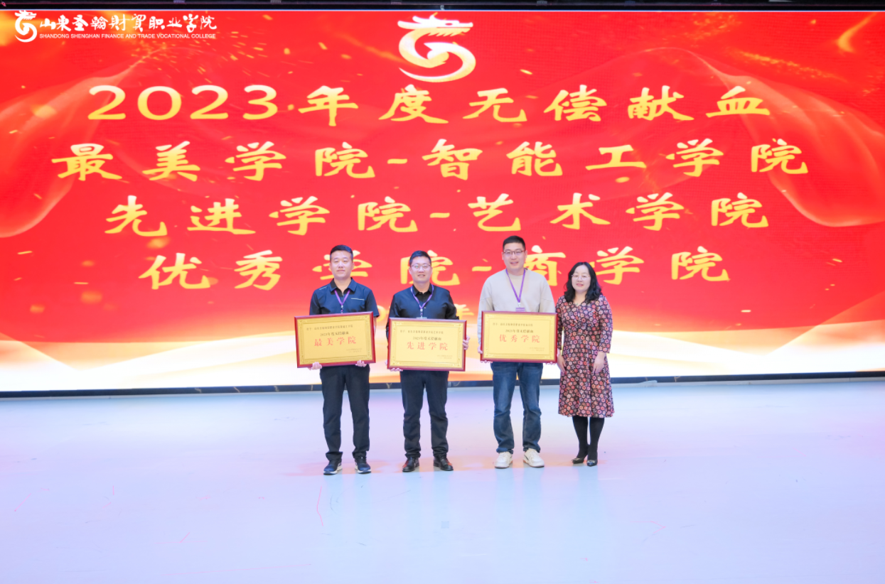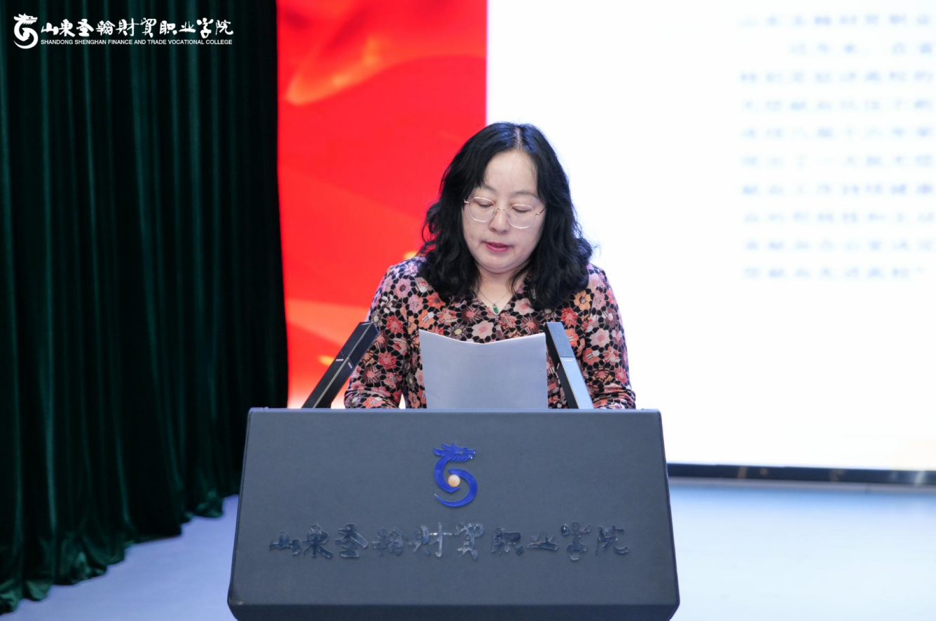 王淑荣宣读《关于表彰山东圣翰财贸职业学院2023年度无偿献血先进集体和个人的决定》。学校被授予“2023 年度无偿献血先进高校”荣誉称号,同时对在2023年度积极支持和参与无偿献血工作的山东圣翰财贸职业学院智能工学院等9个先进集体,周光奇等4名先进个人和冀宁等42名爱心大学生予以通报表彰。