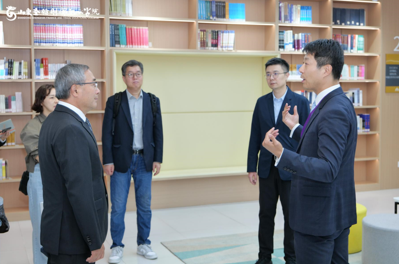 金东柱一行先后参观了学校报告厅、日语教室、韩语教室、图书馆等场所,期间,刘广耀向客人详细介绍了学校的办学条件、基础设施建设等基本情况。金东柱对山东圣翰财贸职业学院的校园环境以及教学环境表示赞许。