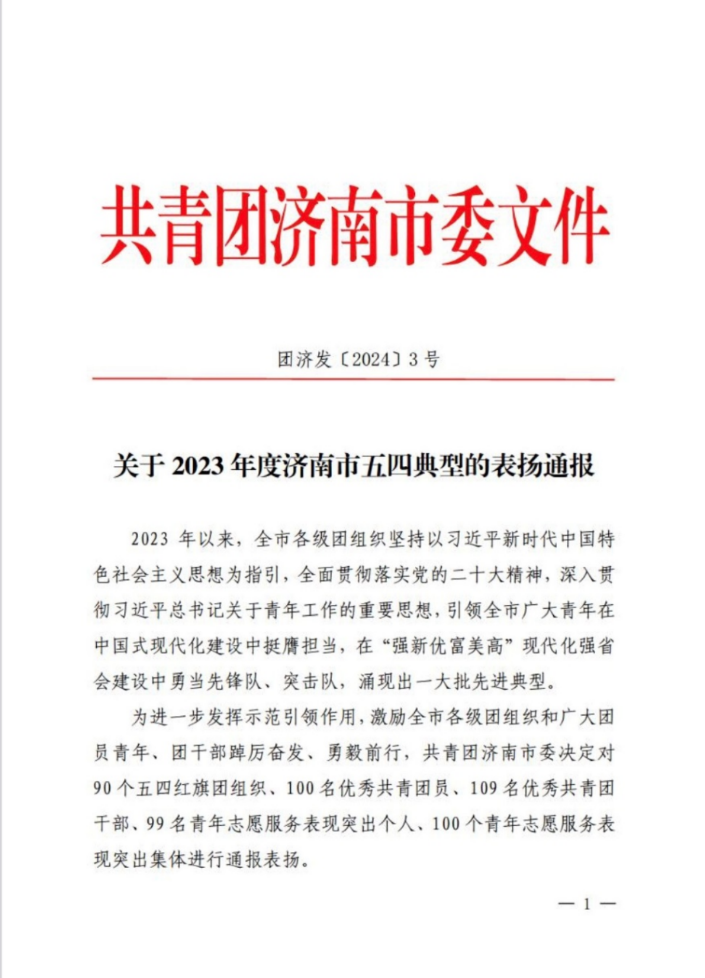 近日,共青团济南市委发布《关于2023年度济南市五四典型的表扬通报》,对2023年度济南市先进典型单位及个人进行表扬,旨在激励全市各级团组织和广大团员青年、团干部踔厉奋发、勇毅前行。