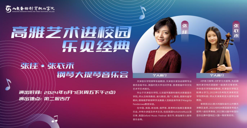 6月7日下午,高雅艺术进校园——乐见经典活动走进山东圣翰财贸职业学院。本次活动特邀天津音乐学院副教授张佳携优秀大提琴演奏者张衣禾带来了一场音乐的盛宴。