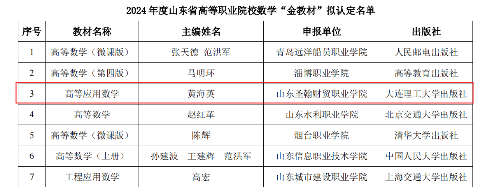 经高校推荐、专家评审等程序,公共基础部推送的《高等应用数学》教材脱颖而出,荣膺“金教材”,此次评选拟认定7部教材为2024年度山东省高等职业院校数学“金教材’,旨在表彰在教学内容创新、教学方法改革以及教材质量提升方面表现卓越的高等职业院校数学教材,推动全省职业教育高质量发展。