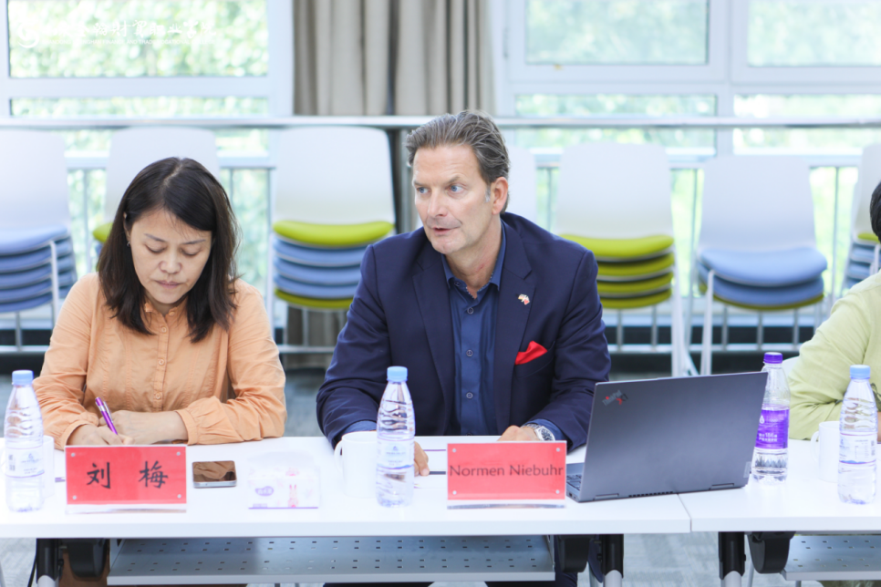 座谈会上,校领导对Normen Niebuhr先生一行的到来表示了热烈的欢迎,并高度评价了北德职教联合会集团在职业教育领域的卓越成就。Normen Niebuhr先生详细介绍了北德职教联合会集团的发展历程与业务范围,强调其从最初助力无业者就业到如今涵盖25个领域的全面职业教育服务,特别是在智慧养老、健康医疗、技能培训等领域的深耕细作。他特别提到,集团与中国职业教育已有长达十年的合作历史,并在上海设立了办事处,为深化中德职业教育合作奠定了坚实基础。