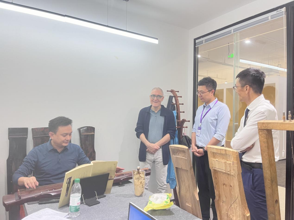 9月26日,在学校领导的陪同下,法国客人Olivier Rimbault参观了古琴工作室。Rimbault先生先是了解了古琴的制作工艺,感受传统工艺的精妙。负责人郑老师介绍到,“琴者,禁也”,古琴是古代用来修身的乐器,疏导情感,颐养情操,演奏者需正襟危坐,放松肩臂时, 他表示,这和他正在学习的中国书法有很多相似之处,在翻译的帮助下,主客双方共同探讨了中国的太极、书法、古琴、绘画等艺术的共通性。