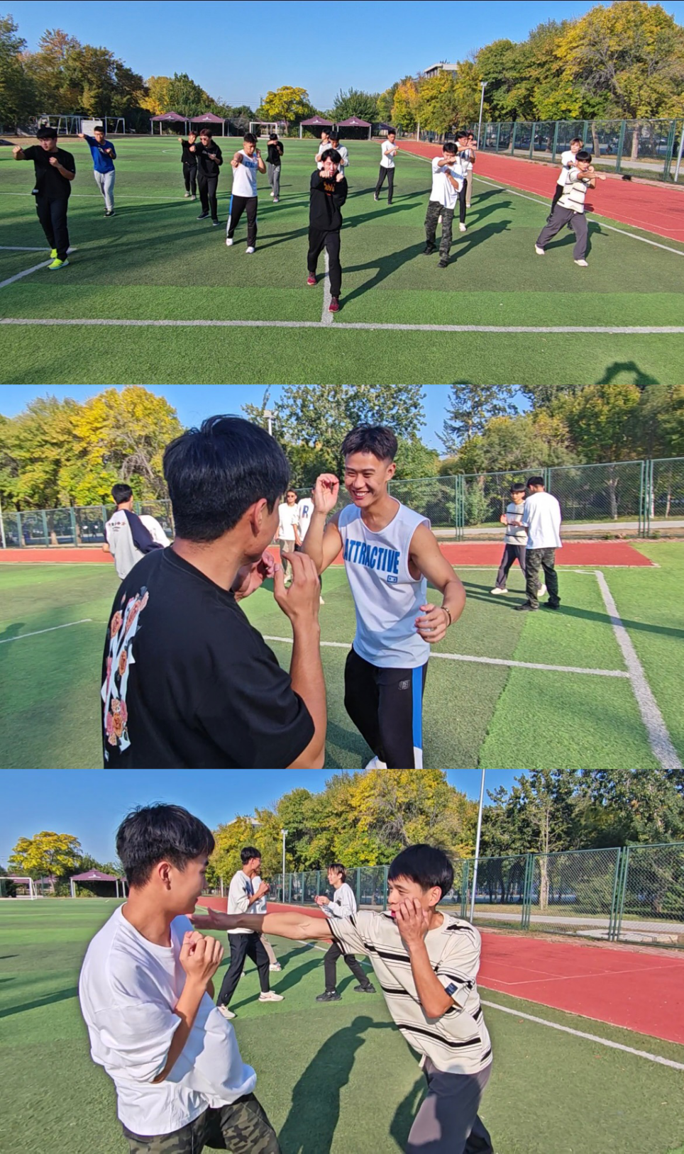 随后,大家转站来到户外,身处于圣翰校园优美的环境中,沐浴在明媚的阳光下,更多的同学主动加入到了拳击练习的队伍中。基础练习过后,赵鑫老师指导同学们进行了一对一“摸肩膀”互动游戏,模拟拳击实战。在有趣的游戏中,同学们洋溢着灿烂的笑容,展现了活力四射的青春风采。