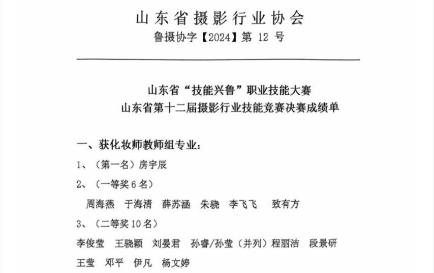 11月22日,山东省“技能兴鲁”职业技能大赛——山东省第十二届摄影行业技能竞赛的决赛获奖结果正式揭晓,艺术学院音乐表演教研室孙莹老师凭借出色的专业技能和卓越的表现,荣获化妆组别教师组的二等奖。同时,艺术学院2023级音乐表演2班的杨硕楠同学作为参赛辅助展示模特,也为此次比赛的圆满成功贡献了自己的力量。