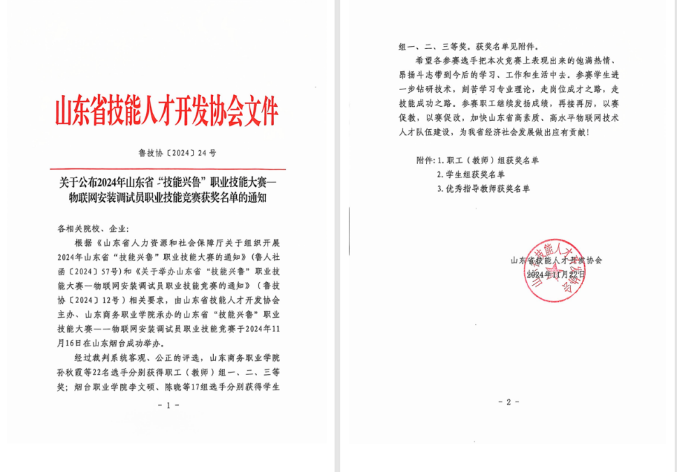 11月15日至16日,山东省“技能兴鲁”职业技能大赛-物联网安装调试员职业技能竞赛在烟台成功举办,此次竞赛由山东省人力资源和社会保障厅指导,山东省技能人才开发协会主办,吸引了全省各地市物联网行业单位、职业院校的20余支代表队参与,赛事分为职工组和学生组两个组别。