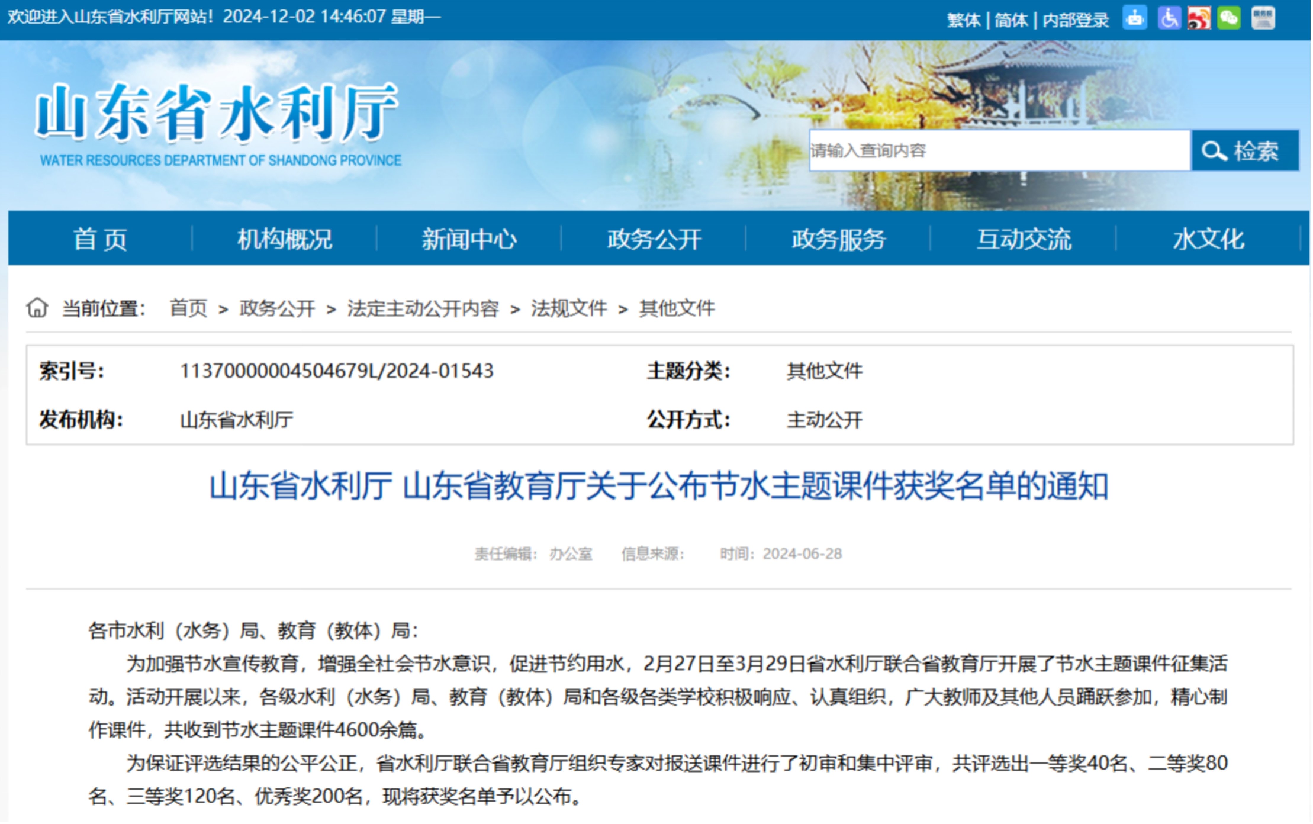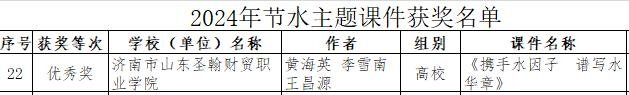 在山东省水利厅和山东省教育厅联合举办的节水主题课件征集活动中,山东圣翰财贸职业学院公共基础部黄海英、李雪南、王昌源老师凭借其精心制作的课件,获得优秀奖,展现了公共基础部在节水教育领域的专业实力和创新精神。